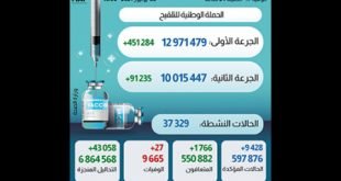 و م ع أعلنت وزارة الصحة، اليوم الاربعاء ، عن تسجيل 9428 إصابة جديدة بكورونا المستجد و1766 حالة شفاء و27 وفاة خلال ال24 ساعة الماضية. وذكرت الوزارة في النشرة اليومية لنتائج الرصد الوبائي لـ(كوفيد-19)، أن عدد الأشخاص الذين تلقوا الجرعة الأولى من اللقاح المضاد ل(كوفيد-19) بلغ 12 مليون و971 ألف …