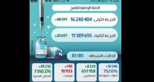 الرباط – أعلنت وزارة الصحة، اليوم الأحد، عن تسجيل 7 آلاف و 380 إصابة جديدة بكوفيد- 19و 9272 حالة شفاء و 84 وفاة خلال ال24 ساعة الماضية، فيما بلغ معدل ملء أسرة الإنعاش المخصصة ل”كوفيد-19″، 52 بالمائة. وذكرت الوزارة في النشرة اليومية لنتائج لـ(كوفيد-19)، أن عدد الأشخاص الذين تلقوا الجرعة …