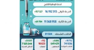 أعلنت وزارة الصحة، اليوم الجمعة، عن تسجيل 10 آلاف و 752 إصابة جديدة بكوفيد 19 و9895 حالة شفاء و 112 وفاة خلال ال24 ساعة الماضية، فيما بلغ معدل ملء أسرة الإنعاش المخصصة ل”كوفيد-19″، 46 بالمائة. وذكرت الوزارة في النشرة اليومية لنتائج لـ(كوفيد-19)، أن عدد الأشخاص الذين تلقوا الجرعة الأولى من …