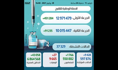 و م ع أعلنت وزارة الصحة، اليوم الاربعاء ، عن تسجيل 9428 إصابة جديدة بكورونا المستجد و1766 حالة شفاء و27 وفاة خلال ال24 ساعة الماضية. وذكرت الوزارة في النشرة اليومية لنتائج الرصد الوبائي لـ(كوفيد-19)، أن عدد الأشخاص الذين تلقوا الجرعة الأولى من اللقاح المضاد ل(كوفيد-19) بلغ 12 مليون و971 ألف …