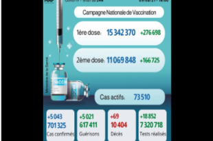أعلنت وزارة الصحة، يوم الاثنين عن تسجيل 5 آلاف و43 إصابة جديدة بكورونا المستجد و5021 حالة شفاء و69 وفاة خلال ال24 ساعة الماضية. وذكرت الوزارة في النشرة اليومية لنتائج لـ(كوفيد-19)، أن عدد الأشخاص الذين تلقوا الجرعة الأولى من اللقاح المضاد ل(كوفيد-19) بلغ 15 مليون و342 ألفا و370 شخصا، فيما بلغ …